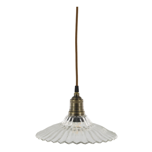 Taklampe i glass med detaljer i messing. H 18 x Ø 21 cm. 2 meter stoffkledd ledning.